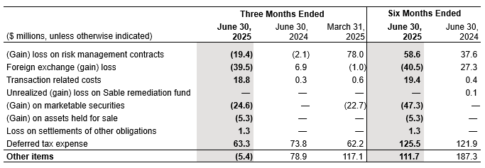 “Other items” is an aggregation of risk management contracts, foreign exchange, transaction related costs, unrealized loss (gain) on Sable remediation fund, loss on settlement of other obligations, and deferred tax expense from both continuing and discontinued operations.